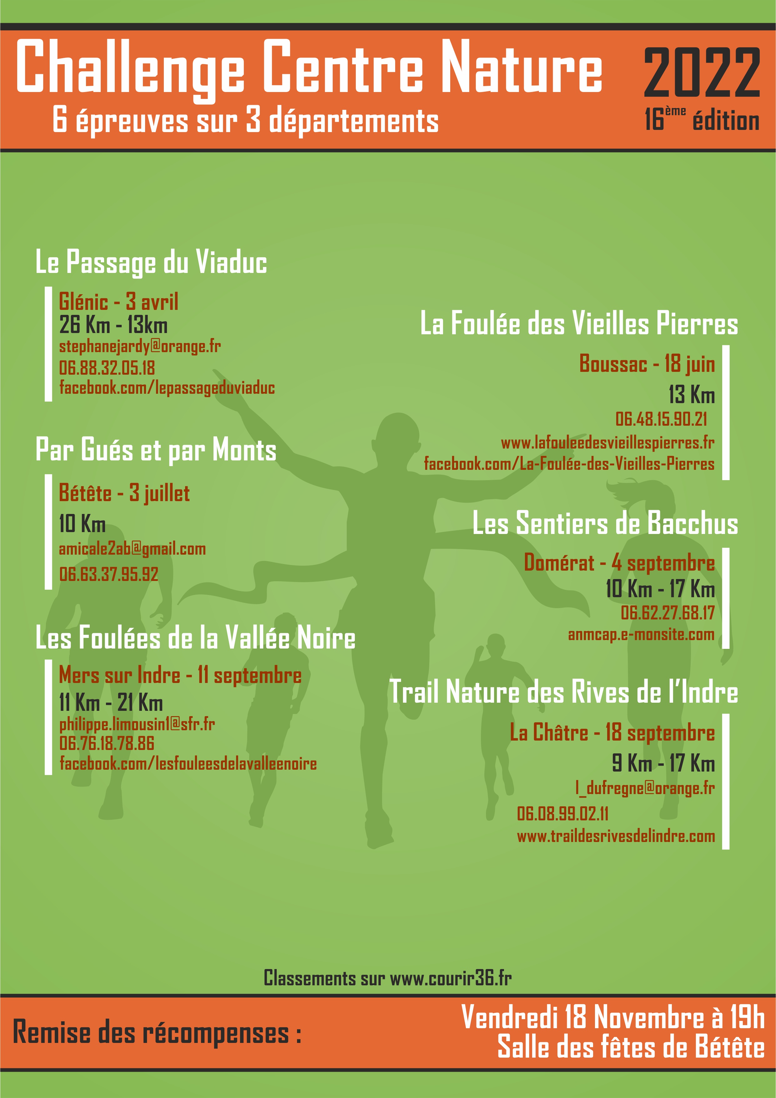 Le coureur peut s’inscrire au Challenge sur Courir 36 jusqu’au 14 avril 2023 et bénéficier d’une remise de 1 euro sur chaque course et n’aura pas de frais bancaire supplémentaire. Tout coureur qui participe, soit aux trois petites courses, soit aux trois longues, est automatiquement classé.